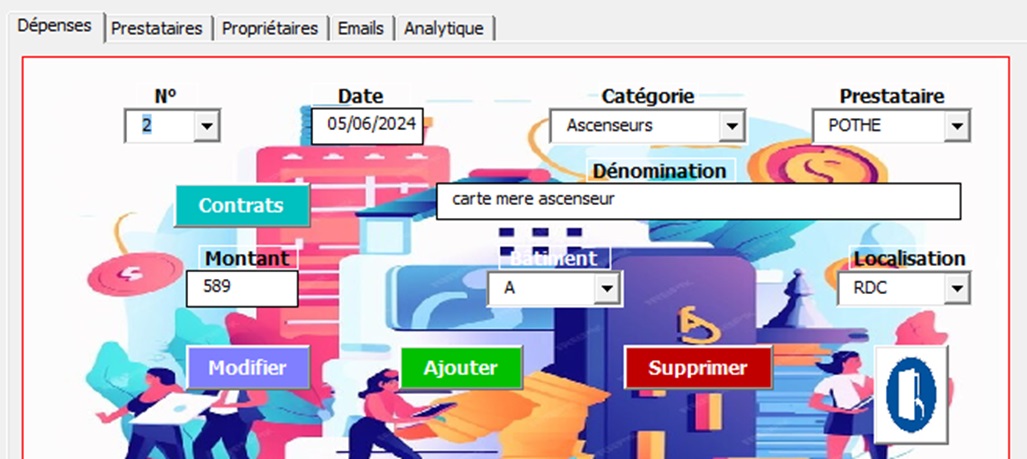 This application enables to manage the spendings of its co-ownership, to manage the owners and the service providers. The owners emails is generated by the manager. Spending analysis can be done per post or location.